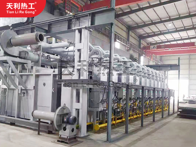 燃氣加熱爐采用側開爐門的爐型結構設計,實現了板材在固溶裝爐、出爐、淬火等功能均在一條軌道上自動控制運行,大幅提高了生產效率,加熱爐底創新采用線形接觸工件,提高了產品的熱處理質量;自動固溶生產線采用了將工件快速淬入冷卻液的整體淬火升降輥道結構設計,實現了快速淬火冷卻;自主設計的自動化控制系統,實現了工件進行固溶熱處理工藝的全自動化作業生產。